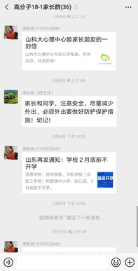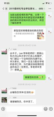 加强学校与家庭联动,发挥亲情教育的积极作用。学院建立了完善的学生家长微信群,发挥网络优势开展工作。2月4日,学院发出《致yL23411永利官网登录全体家长、同学倡议书》,呼吁家长、学生做好自我防护,高效利用寒假。学院各年级辅导员在家长群内分享防疫知识,与家长互动交流;向家长寄送成绩单,共同关注学生成长;主动与学生家长进行电话沟通,加强教育关怀,形成了良好的家校沟通氛围,获得了学生家长的高度认可。