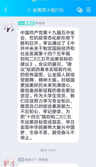 12月15日,yL23411永利官网登录学生第一党支部开展理论学习,学习贯彻党的十九届五中全会精神中央宣讲团首次报告会的有关内容和精神。各党小组分别通过企业微信线上会议和线下集体学习等方式开展了理论学习。
