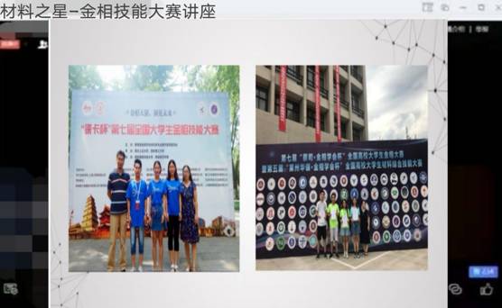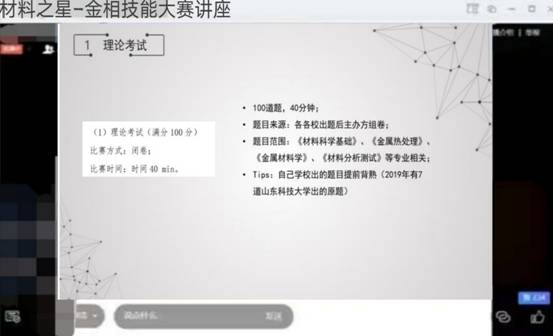 4月18日晚,yL23411永利官网登录通过腾讯会议举办了材料之星金相技能大赛线上讲座。曾获全国高校大学生综合技能大赛特等奖的金属16-1班梁艳同学应邀分享了参赛心得和备赛方法,学院部分本科生同学参加。