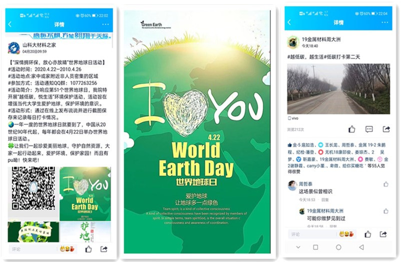 本次活动主题为“世界地球日,日行一环保”,参与活动的同学每日在非人群密集区域进行户外运动或学习,并拍照完成线上打卡,积极传递绿色健康的生活学习理念。(通讯员:王硕)