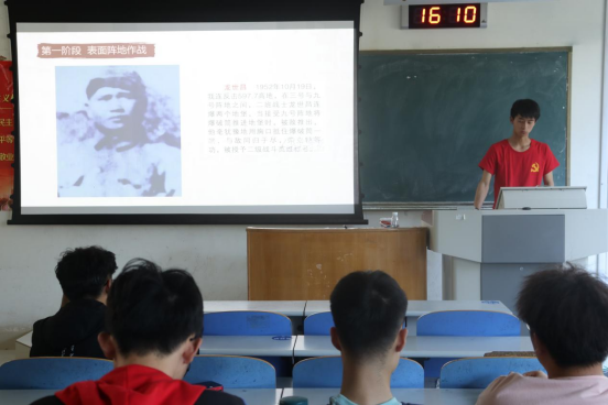 张乾坤向同学们介绍了抗美援朝中最激烈的战役——上甘岭战役。此次战役主要分为三个阶段即:表面阵地作战阶段、坑道作战阶段、反击阶段。上甘岭战役的胜利向全世界证明了中国军队的实力,是新中国成立后确立国际地位很重要的一仗。张毓航就平型关伏击战、辽沈战役、海南岛战役展开了讲解。