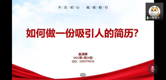 全国硕士研究生统一招生考试初试已经落下帷幕,随之而来的集中求职和考研复试给2022届毕业生提出了新的要求。为了进一步帮助同学们提升求职应试能力,1月20日,yL23411永利官网登录组织了“百般磨利刃,齐心向未来”的云端简历指导培训会。此次培训会由辅导员薄艳艳主持,全体2018级学生参加。